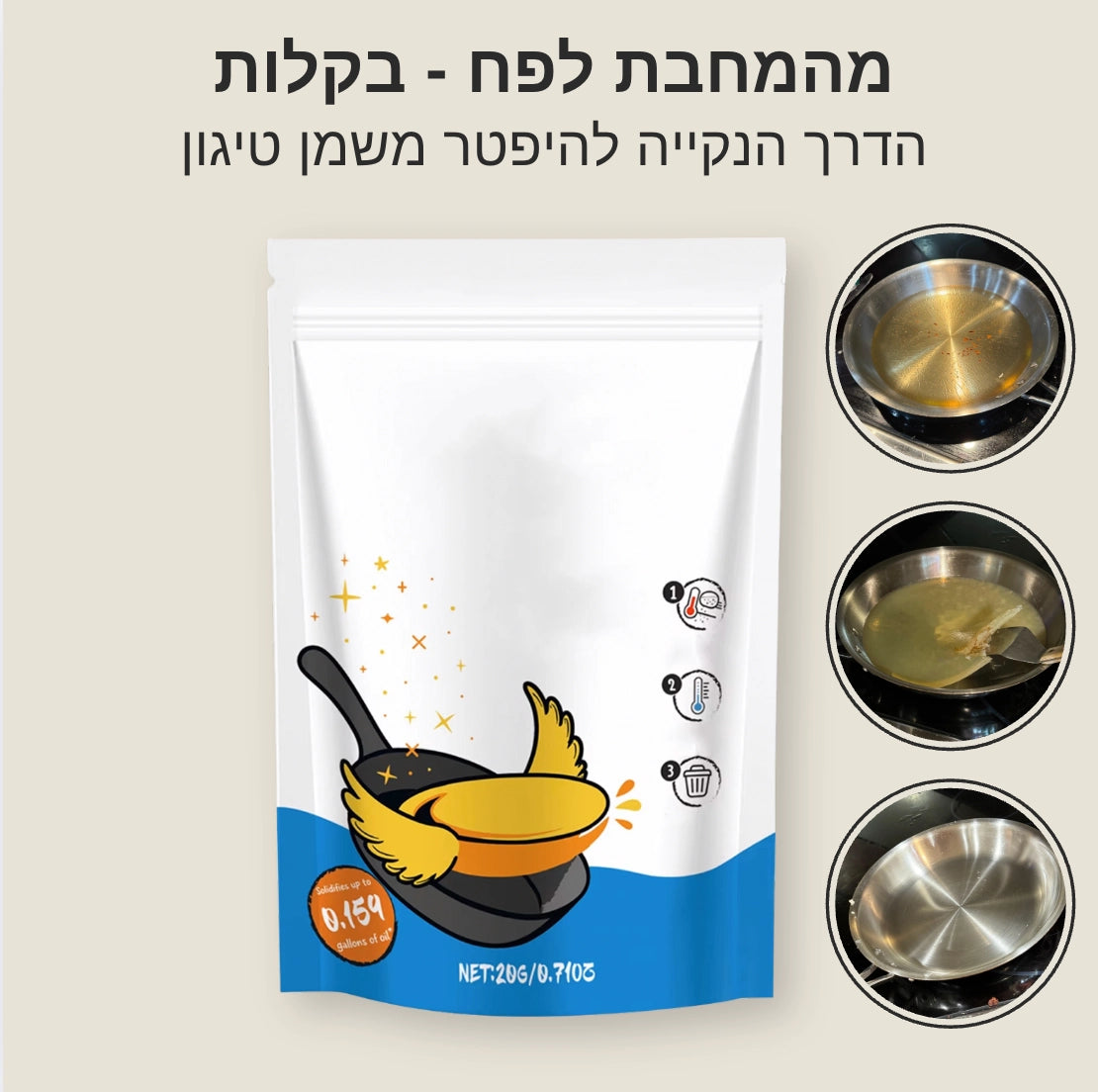 השמן מתמצק לגוש אחד שניתן לזרוק לפח בצורה נקייה ופשוטה.